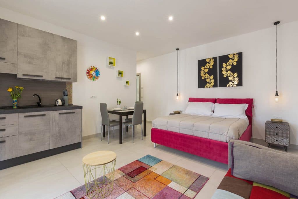 Acquamarina is the apartment furnished with the colors of the sea. It has a spacious kitchen, a private bathroom and a double bedroom, where the blue and turquoise shades of the majolica chase each other giving the environment brightness and freshness.